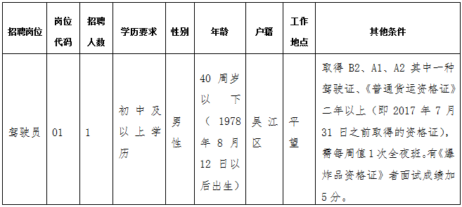 苏州市吴江日杂果品公司因企业经营需要,面向社会公开自主招聘驾驶员1名,现将招聘有关事项公布如下: