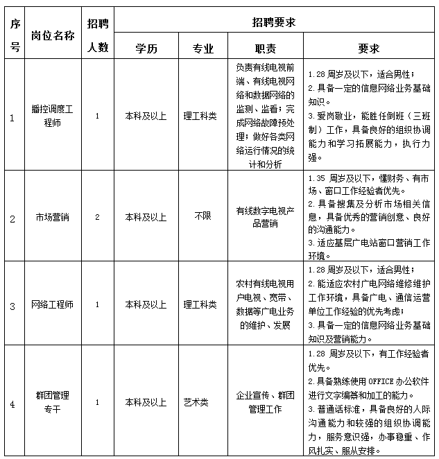 江苏有线网络发展有限责任公司吴江分公司主要负责吴江广电有线网络的规划建设、运行维护和经营管理,主营数字电视、高清互动电视、付费电视、有线宽带、集团数据、智慧城市、云媒体电视信息服务等各类综合性业务。因工作需要,决定公开招聘工作人员5名,现将有关事项公布如下:
