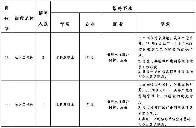 江苏有线网络发展有限责任公司吴江分公司主要负责吴江广电有线网络的规划建设、运行维护和经营管理,主营数字电视、高清互动电视、付费电视、有线宽带、集团数据、智慧城市、云媒体电视信息服务等各类综合性业务。因工作需要,决定公开招聘工作人员3名,现将有关事项公布如下: