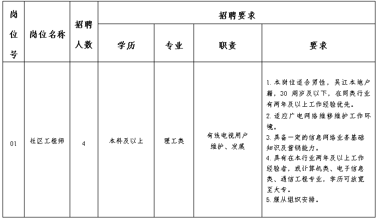 江苏有线网络发展有限责任公司吴江分公司主要负责吴江广电有线网络的规划建设、运行维护和经营管理,主营数字电视、高清互动电视、付费电视、应急广播、广电宽带、集团数据、智慧城市、云媒体电视信息服务、安防监控等各类综合性业务。因工作需要,决定公开招聘社区工程师4名,现将有关事项公布如下: